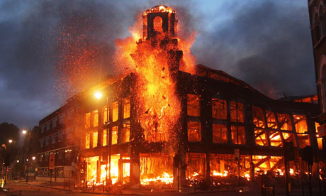 This morning, there is still the faint stench of smoke from burnt out buildings not a five minute walk away from my house. On my first venture outdoors, to see the damage the rioters caused last night, in the worst disorder I have ever seen in my lifetime, I see a man with a hosepipe, putting out a smouldering wheelie bin.