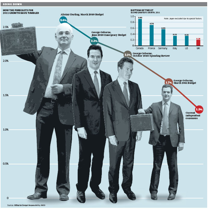 Figures in today’s Independent suggest that Britain is bottom of the G7′s growth league table. Excluding Japan because of the “special factors” caused by the Tohoku earthquake, Britain is growing more slowly than every other major developed economy.